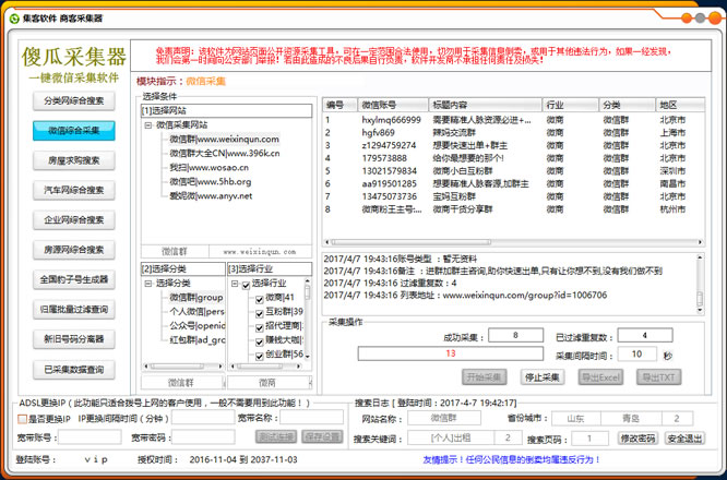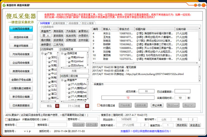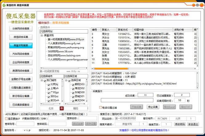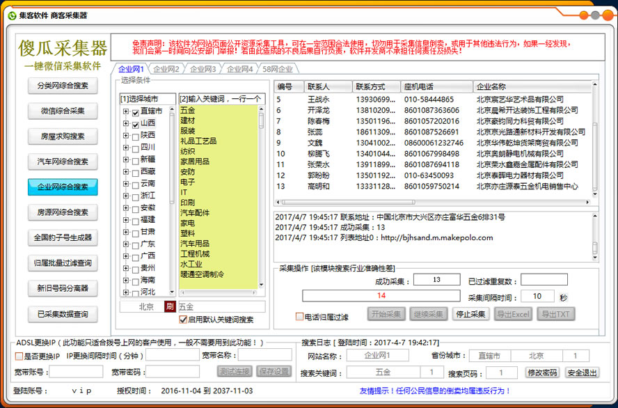 導(dǎo)出Excel文件 導(dǎo)出TXT文件 軟件可以選擇網(wǎng)站,選擇城市,選擇行業(yè)分類等條件搜索您需要的數(shù)據(jù),屬性包括“聯(lián)系人,聯(lián)系電話,標(biāo)題內(nèi)容,行業(yè)分類,省份城市,聯(lián)系地址,來(lái)源網(wǎng)站,來(lái)源網(wǎng)址等等”。 除了采集功能之外,軟件還有自動(dòng)過(guò)濾重復(fù)功能,號(hào)碼歸屬地過(guò)濾功能,防限制采集設(shè)置功能(可以避免大部分情況下不被限制),自動(dòng)ADLS撥號(hào)功能(撥號(hào)上網(wǎng)的客戶才能使用),導(dǎo)出Excel文件功能,導(dǎo)出TXT文件功能,時(shí)間段篩選信息功能(此功能只限有“更新時(shí)間”段的信息才能使用),歷史數(shù)據(jù)查詢功能