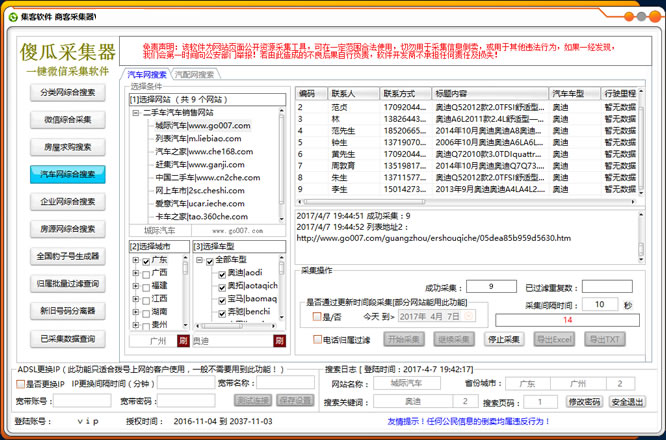 》來(lái)源網(wǎng)站:汽車之家,趕集汽車,五八汽車,城際汽車,列表汽車,中國(guó)二手車,網(wǎng)上車市,愛(ài)意汽車,卡車之家,搜狐汽車。 》行業(yè)類型:二手車。 》數(shù)據(jù)屬性:聯(lián)系人,聯(lián)系電話,標(biāo)題內(nèi)容,汽車車型,行駛里程,上牌時(shí)間,更新時(shí)間,省份城市,來(lái)源網(wǎng)站,信息類型,來(lái)源地址。 》簡(jiǎn)介說(shuō)明:該模塊主要挖掘個(gè)人車主資源,數(shù)據(jù)源來(lái)自各大汽車網(wǎng)站的二手車銷售模塊,雖然是賣二手車,如果是自己想賣掉自己車的人,那么他們也是車主,因?yàn)樗麄兛赡芟霌Q新車了。