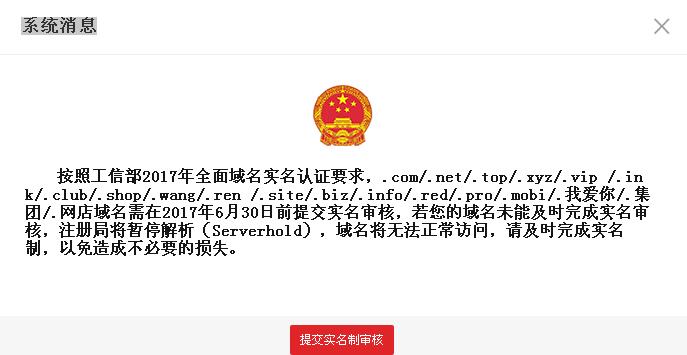 按照工信部2017年全面域名實(shí)名認(rèn)證要求,.com/.net/.top/.xyz/.vip /.ink/.club/.shop/.wang/.ren /.site/.biz/.info/.red/.pro/.mobi/.我愛你/.集團(tuán)/.網(wǎng)店域名需在2017年6月30日前提交實(shí)名審核,若您的域名未能及時(shí)完成實(shí)名審核,注冊(cè)局將暫停解析(Serverhold),域名將無法正常訪問,請(qǐng)及時(shí)完成實(shí)名制,以免造成不必要的損失。
