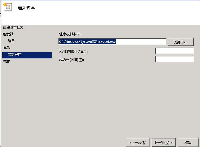 6、點擊下一步,進入啟動程序設置,點擊瀏覽選擇:C:\Windows\System32\iisreset.exe 大家應該知道iisreset.exe是IIS服務器的重啟程序。如圖所示: